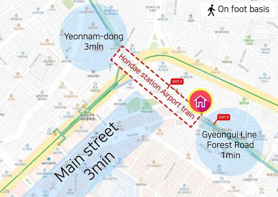 Near Hongik University Station Suite Room provides an equipped kitchenette with all necessary utensils to prepare meals. Near Hongik University Station Suite Room is located in the immediate vicinity of Hongik University tube station.